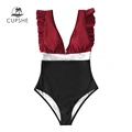 Special Offer CUPSHE Red Black and White Ruffled OnePiece Swimsuit Sexy Deep Vneck Women Monokini 2020 Girls Be with FREE Shipping Worldwide!